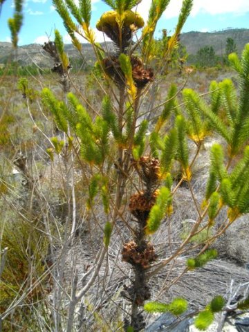 A series of old infructescences (inflorescences successfully turned into collections of fruits) can be observed here, persisting from several previous seasons and retaining their durable seeds. These banking facilities for species survival are spaced neatly from year to year up the stem on this plant that was photographed in the mountains above Botrivier (Bean and Johns, 2005; www.plantzafrica.com).