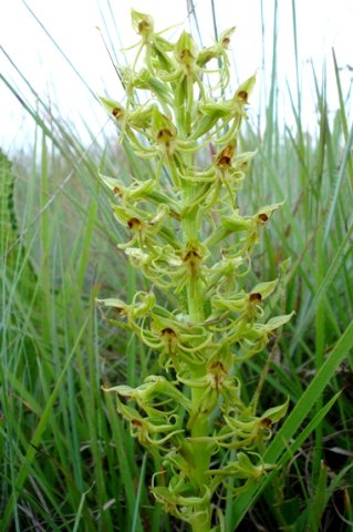 The stem leaves, grading into the floral bracts, are lance-shaped with acutely pointed tips. They become 2 cm long, the bracts up to 1 cm (Pooley, 1998; www.africanorchids.dk).